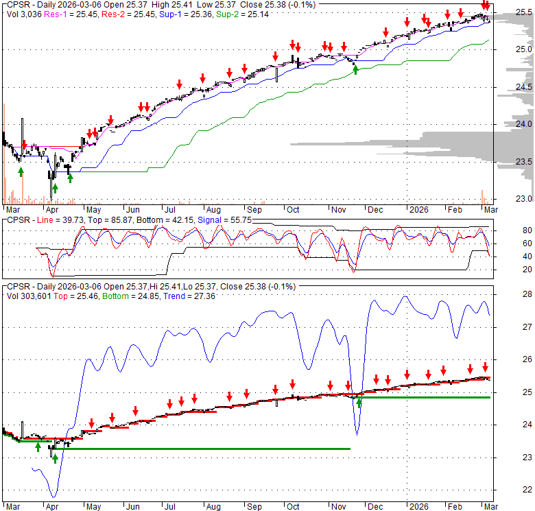 Price has closed below its short-term moving average. Short-term moving average is currently above mid-term; and above long-term moving average. From the relationship between price and moving averages: This stock is NEUTRAL in short-term; and BULLISH in mid-long term.[ CPSR ] has closed above bottom band by 20.3%. Bollinger Bands are 17.6% narrower than normal. The current width of the bands does not suggest anything about the future direction or movement of prices.