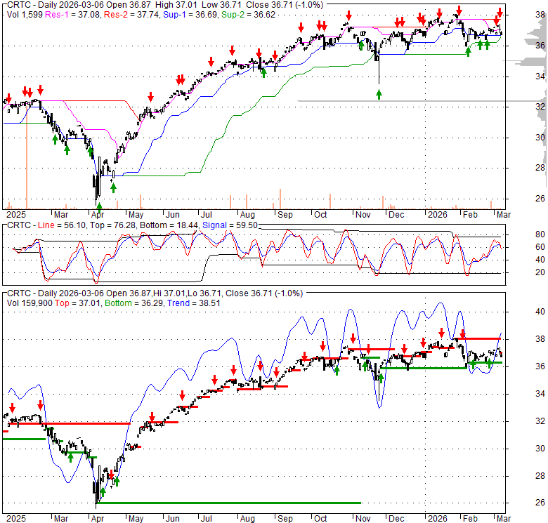 Price has closed below its short-term moving average. Short-term moving average is currently below mid-term; and above long-term moving average. From the relationship between price and moving averages: This stock is BEARISH in short-term; and NEUTRAL in mid-long term.[ CRTC ] has closed above bottom band by 33.7%. Bollinger Bands are 39.2% narrower than normal. The current width of the bands does not suggest anything about the future direction or movement of prices.