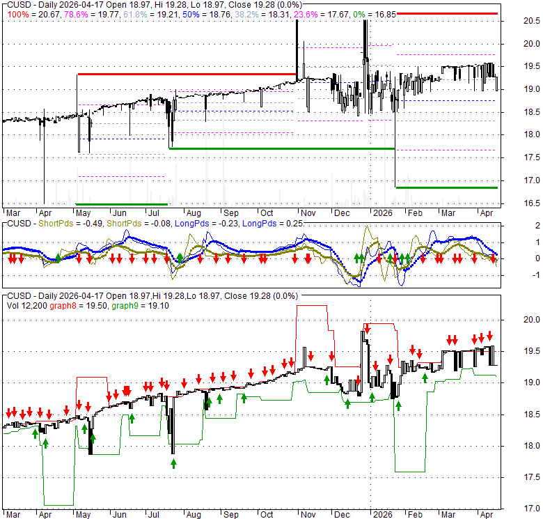 Price has closed above its short-term moving average. Short-term moving average is currently below mid-term; and above long-term moving average. From the relationship between price and moving averages: This stock is NEUTRAL in short-term; and NEUTRAL in mid-long term.[ CUSD ] has closed below upper band by 29.5%. Bollinger Bands are 9.8% narrower than normal. The current width of the bands does not suggest anything about the future direction or movement of prices.