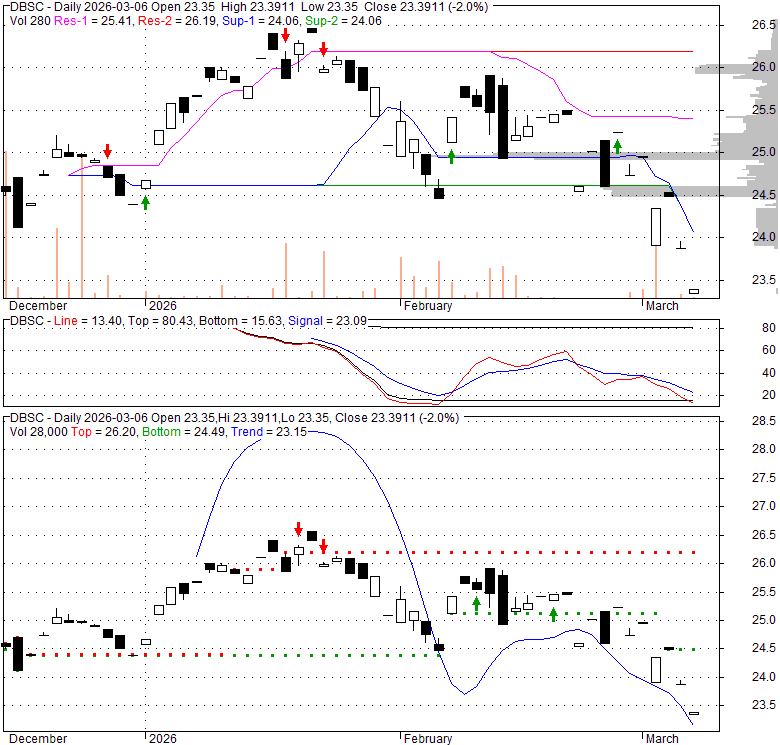 Price has closed below its short-term moving average. Short-term moving average is currently below mid-term; and below long-term moving average. From the relationship between price and moving averages: This stock is BEARISH in short-term; and NEUTRAL in mid-long term.[ DBSC ] has closed below the lower bollinger band by 10.3%. If price is in a downtrend band; this downward trend might continue. However a short term pullback inside the band is likely. Bollinger Bands are 0% narrower than normal.