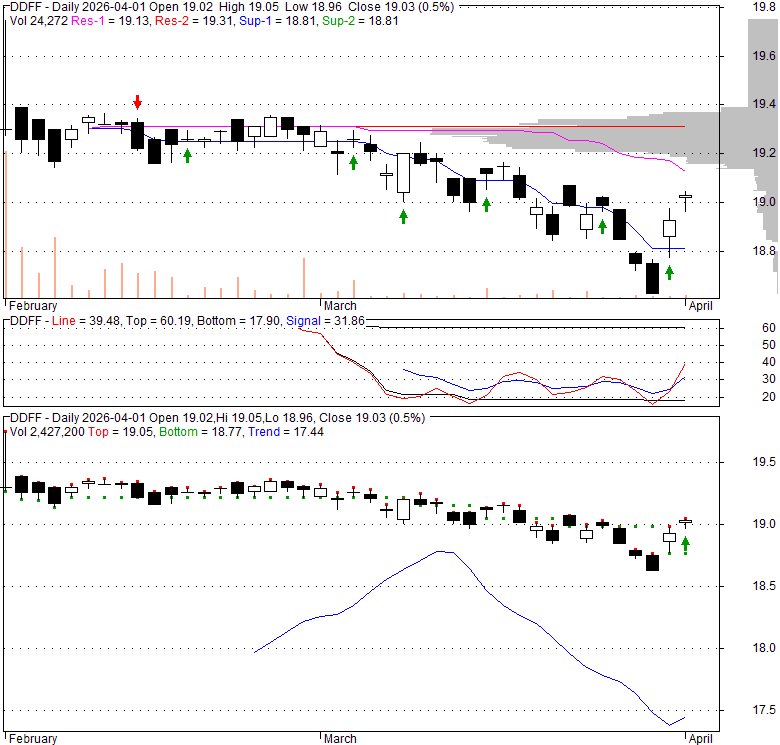 Price has closed above its short-term moving average. Short-term moving average is currently below mid-term; and below long-term moving average. From the relationship between price and moving averages: This stock is NEUTRAL in short-term; and NEUTRAL in mid-long term.[ DDFF ] has closed below upper band by 35.1%. Bollinger Bands are 0% narrower than normal.