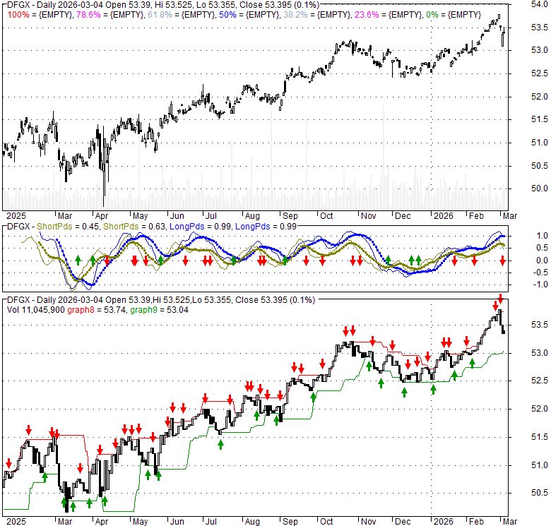 Price has closed below its short-term moving average. Short-term moving average is currently above mid-term; and above long-term moving average. From the relationship between price and moving averages: This stock is NEUTRAL in short-term; and BULLISH in mid-long term.[ DFGX ] has closed above bottom band by 36.8%. Bollinger Bands are 20.3% wider than normal. The current width of the bands does not suggest anything about the future direction or movement of prices.