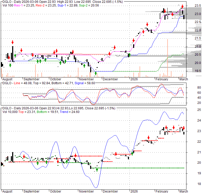 Price has closed below its short-term moving average. Short-term moving average is currently above mid-term; and above long-term moving average. From the relationship between price and moving averages: This stock is NEUTRAL in short-term; and BULLISH in mid-long term.[ DGLO ] has closed above bottom band by 11.4%. Bollinger Bands are 22.3% narrower than normal. The current width of the bands does not suggest anything about the future direction or movement of prices.