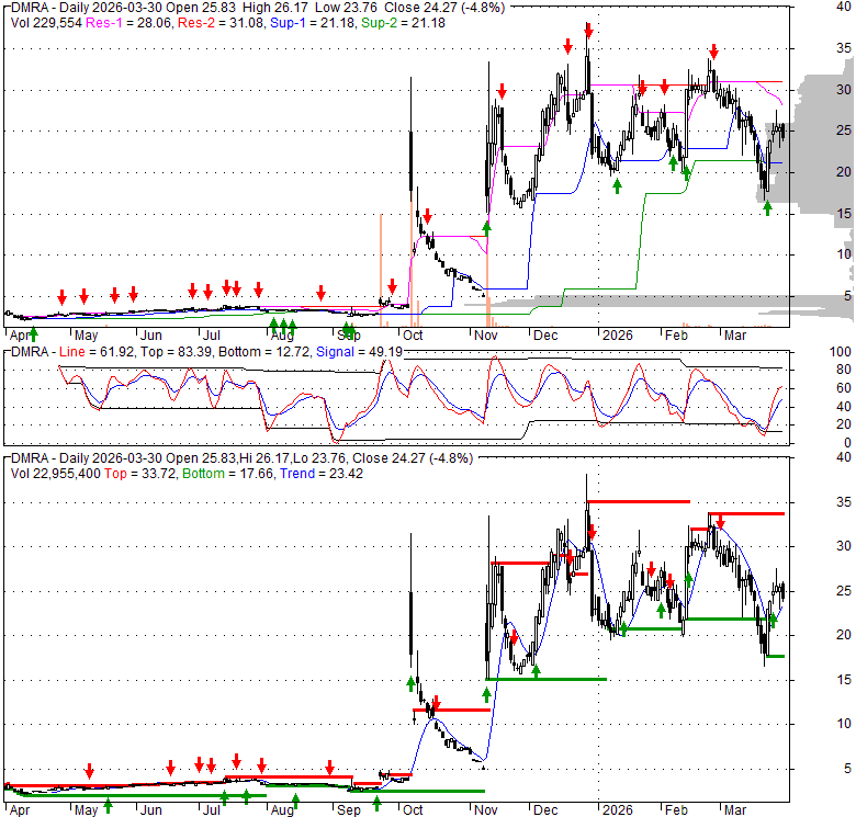 Price has closed below its short-term moving average. Short-term moving average is currently below mid-term; and above long-term moving average. From the relationship between price and moving averages: This stock is BEARISH in short-term; and NEUTRAL in mid-long term.[ DMRA ] has closed below upper band by 46.9%. Bollinger Bands are 29.6% narrower than normal. The current width of the bands does not suggest anything about the future direction or movement of prices.