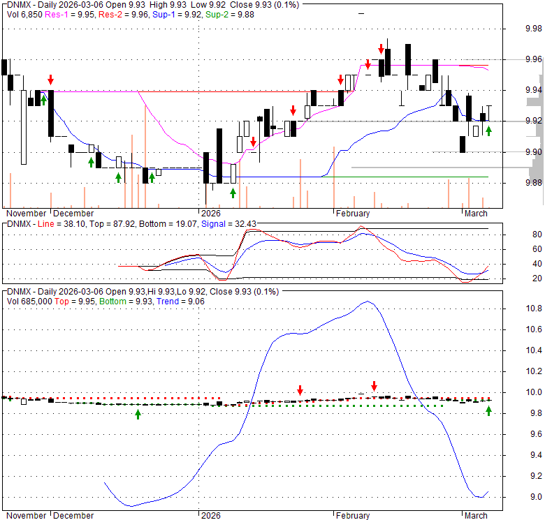 Price has closed above its short-term moving average. Short-term moving average is currently below mid-term; and below long-term moving average. From the relationship between price and moving averages: This stock is NEUTRAL in short-term; and NEUTRAL in mid-long term.[ DNMX ] has closed above bottom band by 46.4%. Bollinger Bands are 0% narrower than normal.