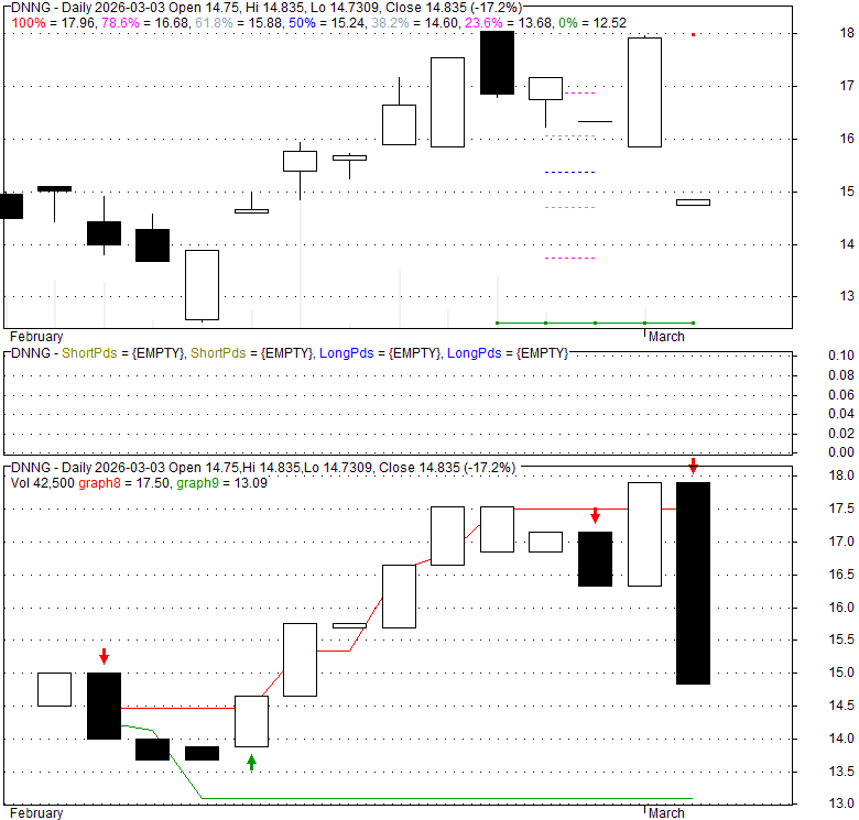 Price has closed below its short-term moving average. Short-term moving average is currently below mid-term; and below long-term moving average. From the relationship between price and moving averages: This stock is NEUTRAL in short-term; and NEUTRAL in mid-long term.[ DNNG ] has closed Bollinger Bands are 0% narrower than normal.