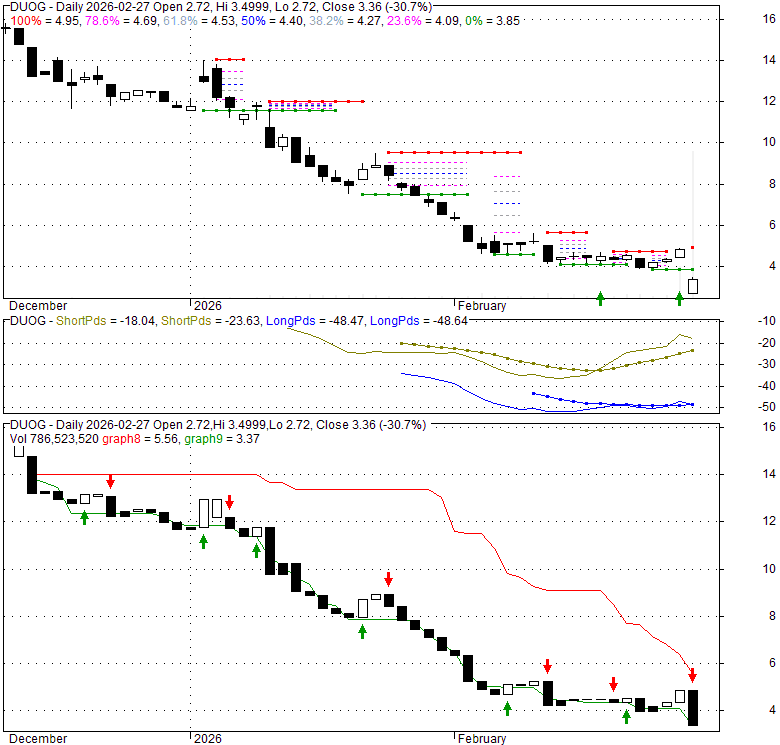 Price has closed below its short-term moving average. Short-term moving average is currently below mid-term; and below long-term moving average. From the relationship between price and moving averages: This stock is BEARISH in short-term; and NEUTRAL in mid-long term.[ DUOG ] has closed below the lower bollinger band by 10.6%. Bollinger Bands are 0% narrower than normal.