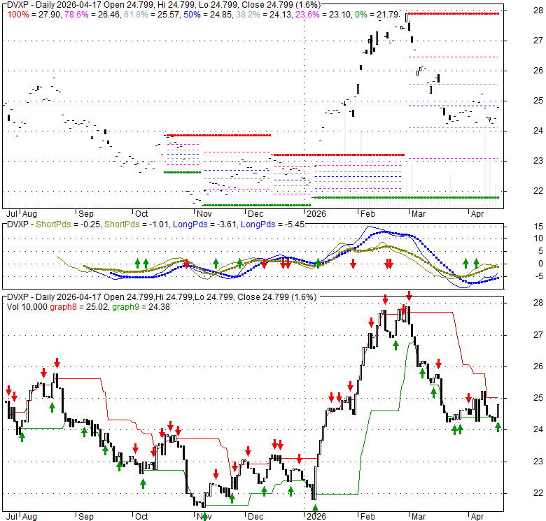 Price has closed above its short-term moving average. Short-term moving average is currently below mid-term; and below long-term moving average. From the relationship between price and moving averages: This stock is NEUTRAL in short-term; and NEUTRAL in mid-long term.[ DVXP ] has closed below upper band by 35.1%. Bollinger Bands are 51.4% narrower than normal. The narrow width of the bands suggests low volatility as compared to its normal range. The bands have been in this narrow range for 7 bars. This is a sign that the market may be about to initiate a new trend.