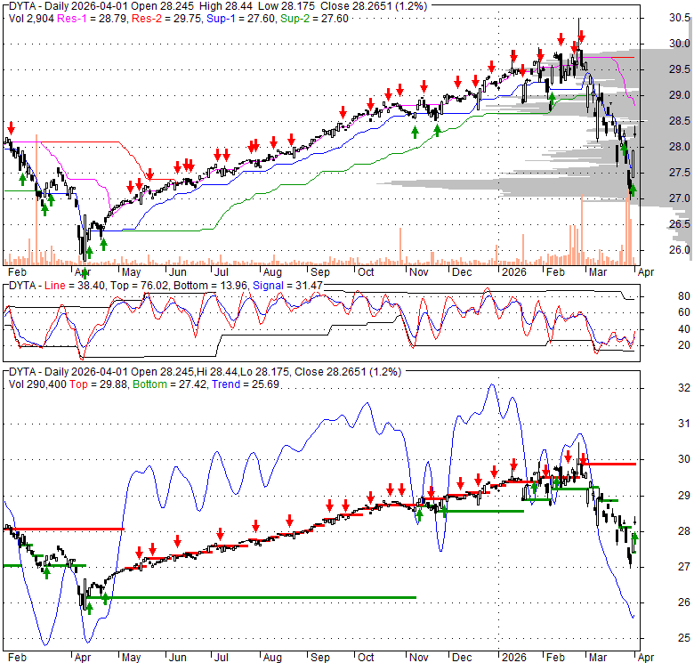 Price has closed above its short-term moving average. Short-term moving average is currently below mid-term; and below long-term moving average. From the relationship between price and moving averages: This stock is NEUTRAL in short-term; and BEARISH in mid-long term.[ DYTA ] has closed below upper band by 41.3%. Bollinger Bands are 122.3% wider than normal. The large width of the bands suggest high volatility as compared to its normal range. The bands have been in this wide range for 19 days. This is a sign that the current trend might continue.