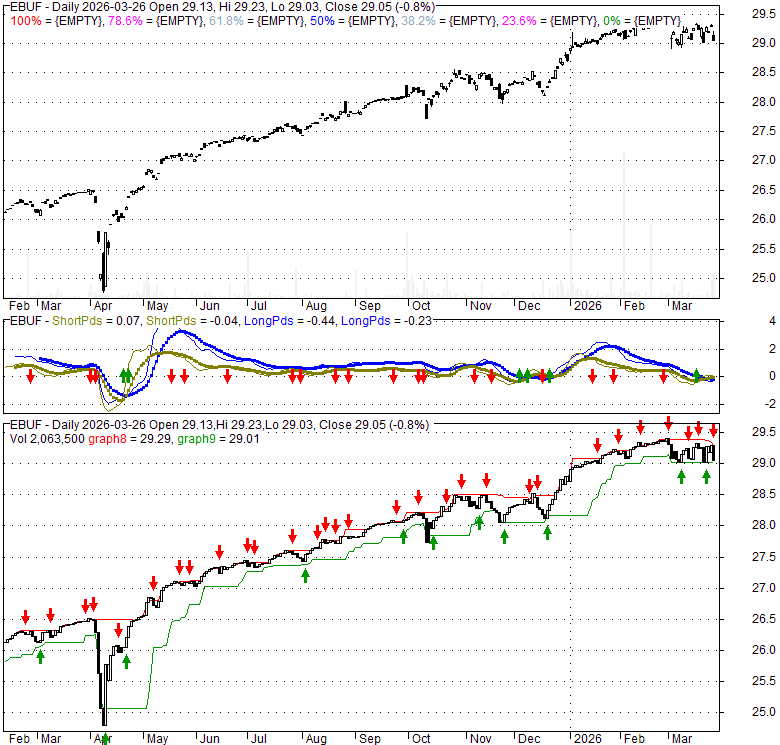 Price has closed below its short-term moving average. Short-term moving average is currently below mid-term; and above long-term moving average. From the relationship between price and moving averages: This stock is BEARISH in short-term; and NEUTRAL in mid-long term.[ EBUF ] has closed above bottom band by 17.8%. Bollinger Bands are 10.3% narrower than normal. The current width of the bands does not suggest anything about the future direction or movement of prices.
