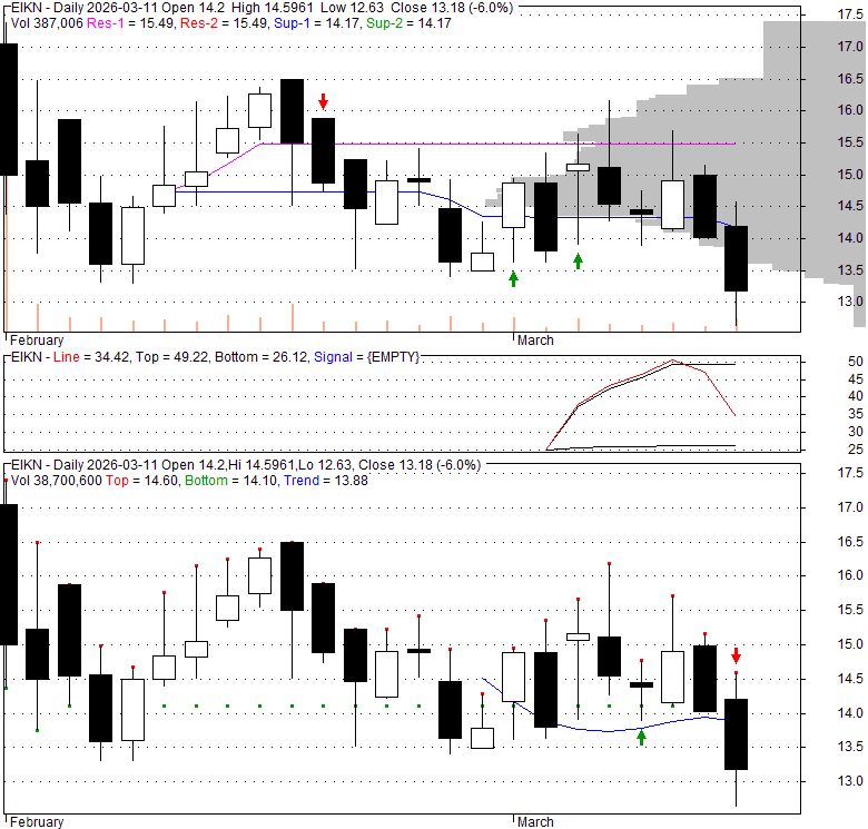 Price has closed below its short-term moving average. Short-term moving average is currently below mid-term; and below long-term moving average. From the relationship between price and moving averages: This stock is NEUTRAL in short-term; and NEUTRAL in mid-long term.[ EIKN ] has closed below the lower bollinger band by 21.0%. Bollinger Bands are 0% narrower than normal.