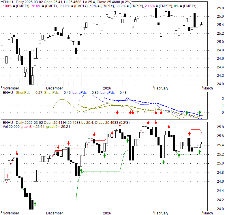 Price has closed above its short-term moving average. Short-term moving average is currently below mid-term; and below long-term moving average. From the relationship between price and moving averages: This stock is NEUTRAL in short-term; and NEUTRAL in mid-long term.[ ENHU ] has closed below upper band by 42.3%. Bollinger Bands are 0% narrower than normal.