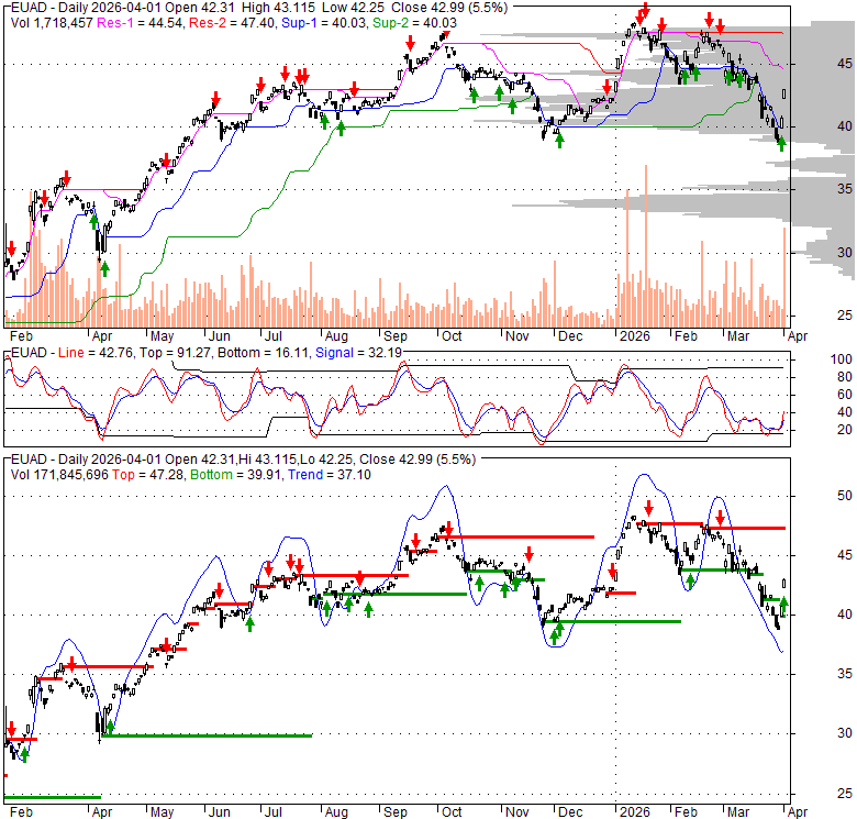 Price has closed above its short-term moving average. Short-term moving average is currently below mid-term; and below long-term moving average. From the relationship between price and moving averages: This stock is NEUTRAL in short-term; and NEUTRAL in mid-long term.[ EUAD ] has closed below upper band by 32.6%. Bollinger Bands are 47% wider than normal. The large width of the bands suggest high volatility as compared to its normal range. The bands have been in this wide range for 4 days. This is a sign that the current trend might continue.