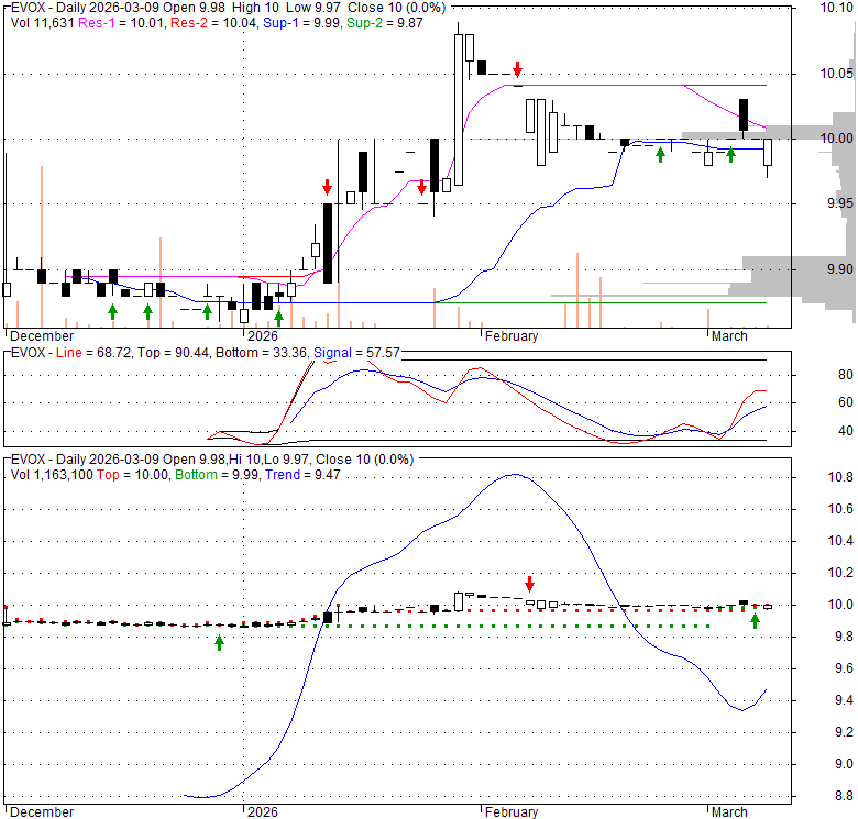 Price has closed above its short-term moving average. Short-term moving average is currently above mid-term; and below long-term moving average. From the relationship between price and moving averages: This stock is BULLISH in short-term; and NEUTRAL in mid-long term.[ EVOX ] has closed below upper band by 32.3%. Bollinger Bands are 0% narrower than normal.