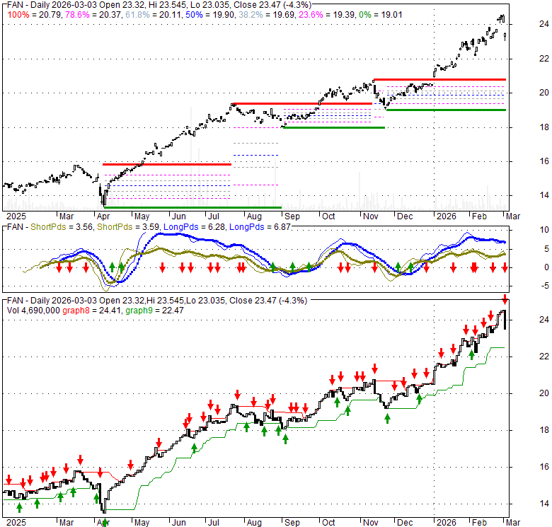 Price has closed below its short-term moving average. Short-term moving average is currently above mid-term; and above long-term moving average. From the relationship between price and moving averages: This stock is NEUTRAL in short-term; and BULLISH in mid-long term.[ FAN ] has closed above bottom band by 40.8%. Bollinger Bands are 41.1% wider than normal. The large width of the bands suggest high volatility as compared to its normal range. The bands have been in this wide range for 3 days. This is a sign that the current trend might continue.