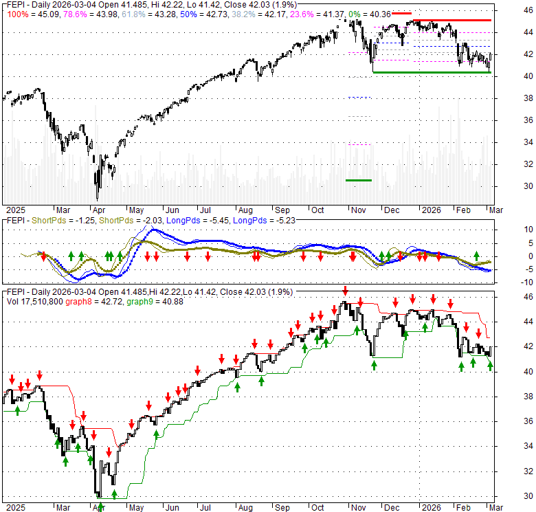 Price has closed above its short-term moving average. Short-term moving average is currently below mid-term; and below long-term moving average. From the relationship between price and moving averages: This stock is NEUTRAL in short-term; and BEARISH in mid-long term.[ FEPI ] has closed below upper band by 32.3%. Bollinger Bands are 47.1% narrower than normal. The narrow width of the bands suggests low volatility as compared to its normal range. The bands have been in this narrow range for 0 bars. This is a sign that the market may be about to initiate a new trend.