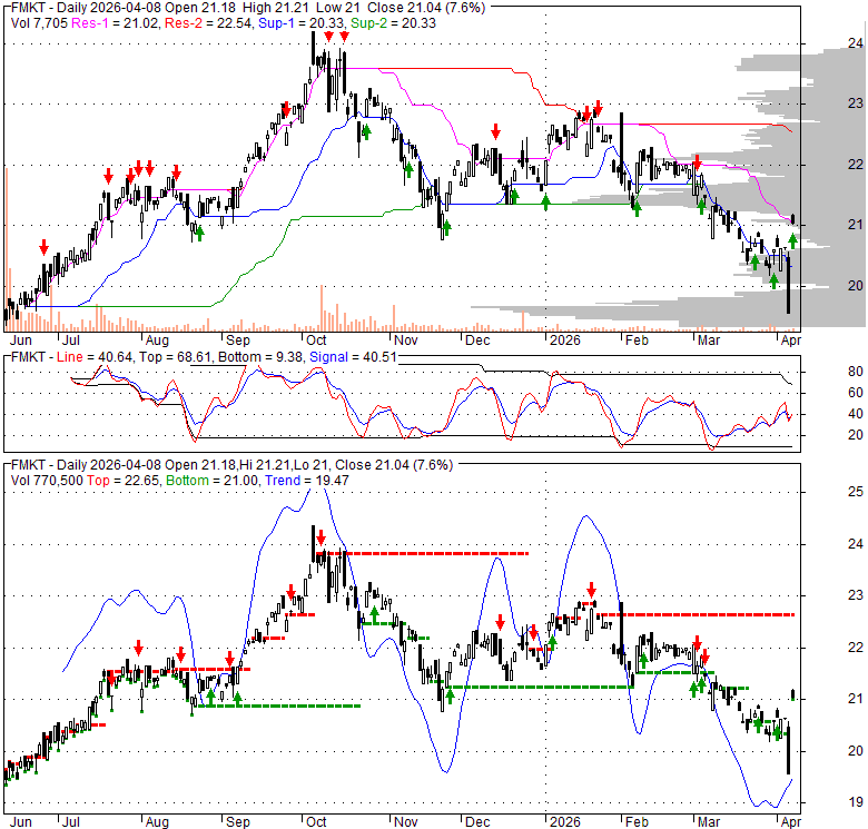 Price has closed above its short-term moving average. Short-term moving average is currently below mid-term; and below long-term moving average. From the relationship between price and moving averages: This stock is NEUTRAL in short-term; and BEARISH in mid-long term.[ FMKT ] has closed below upper band by 11.7%. Bollinger Bands are 0.7% wider than normal. The current width of the bands does not suggest anything about the future direction or movement of prices.