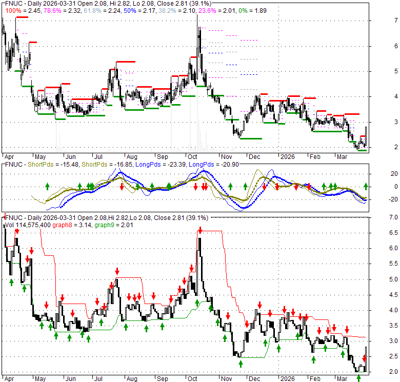 Price has closed above its short-term moving average. Short-term moving average is currently below mid-term; and below long-term moving average. From the relationship between price and moving averages: This stock is NEUTRAL in short-term; and BEARISH in mid-long term.[ FNUC ] has closed below upper band by 16.4%. Bollinger Bands are 15.9% wider than normal. The current width of the bands does not suggest anything about the future direction or movement of prices.