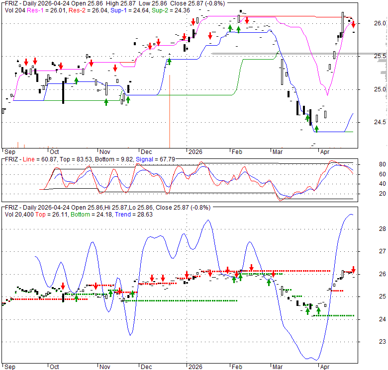 Price has closed below its short-term moving average. Short-term moving average is currently above mid-term; and above long-term moving average. From the relationship between price and moving averages: This stock is NEUTRAL in short-term; and NEUTRAL in mid-long term.[ FRIZ ] has closed below upper band by 37.3%. Bollinger Bands are 88.7% wider than normal. The large width of the bands suggest high volatility as compared to its normal range. The bands have been in this wide range for 11 days. This is a sign that the current trend might continue.