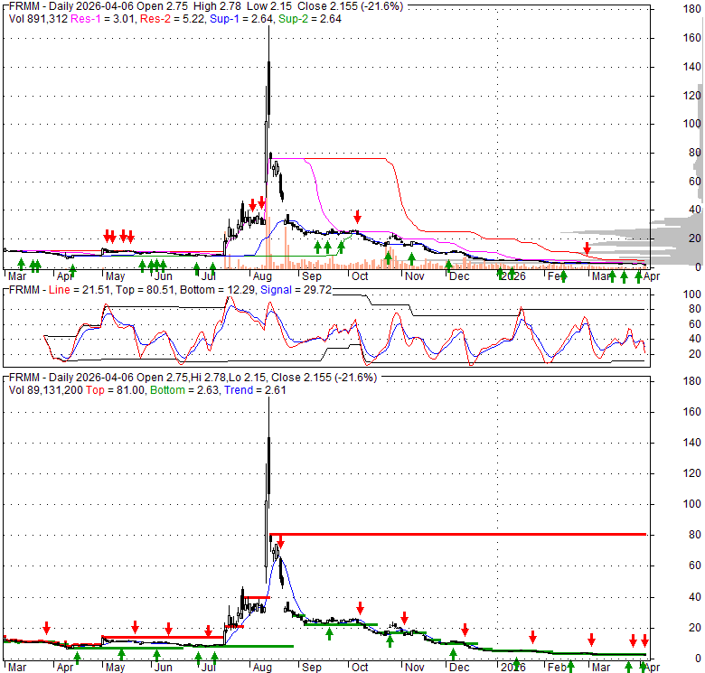 Price has closed below its short-term moving average. Short-term moving average is currently below mid-term; and below long-term moving average. From the relationship between price and moving averages: This stock is BEARISH in short-term; and BEARISH in mid-long term.[ FRMM ] has closed below the lower bollinger band by 6.3%. Bollinger Bands are 74% narrower than normal. The narrow width of the bands suggests low volatility as compared to its normal range. The bands have been in this narrow range for 141 bars. This is a sign that the market may be about to initiate a new trend.