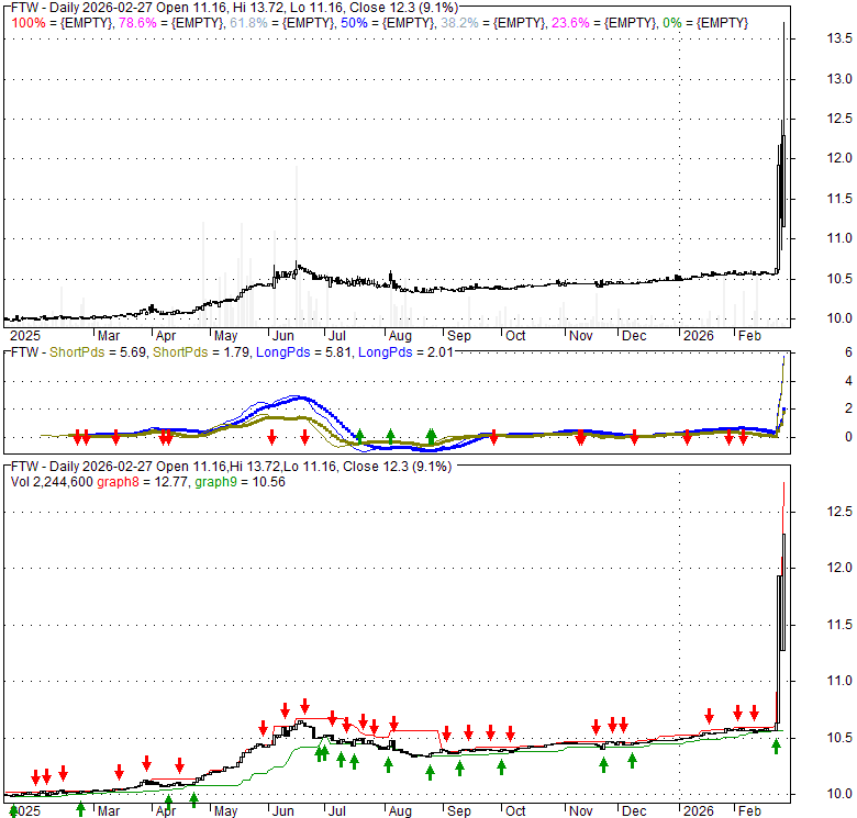 Price has closed above its short-term moving average. Short-term moving average is currently above mid-term; and above long-term moving average. From the relationship between price and moving averages: This stock is BULLISH in short-term; and BULLISH in mid-long term.[ FTW ] has closed above the upper band by 18.3%. If price is in a uptrend band; this upward trend in price might continue. However a short term pullback inside the band is likely.Bollinger Bands are 2006.1% wider than normal. The large width of the bands suggest high volatility as compared to its normal range. The bands have been in this wide range for 2 days. This is a sign that the current trend might continue.
