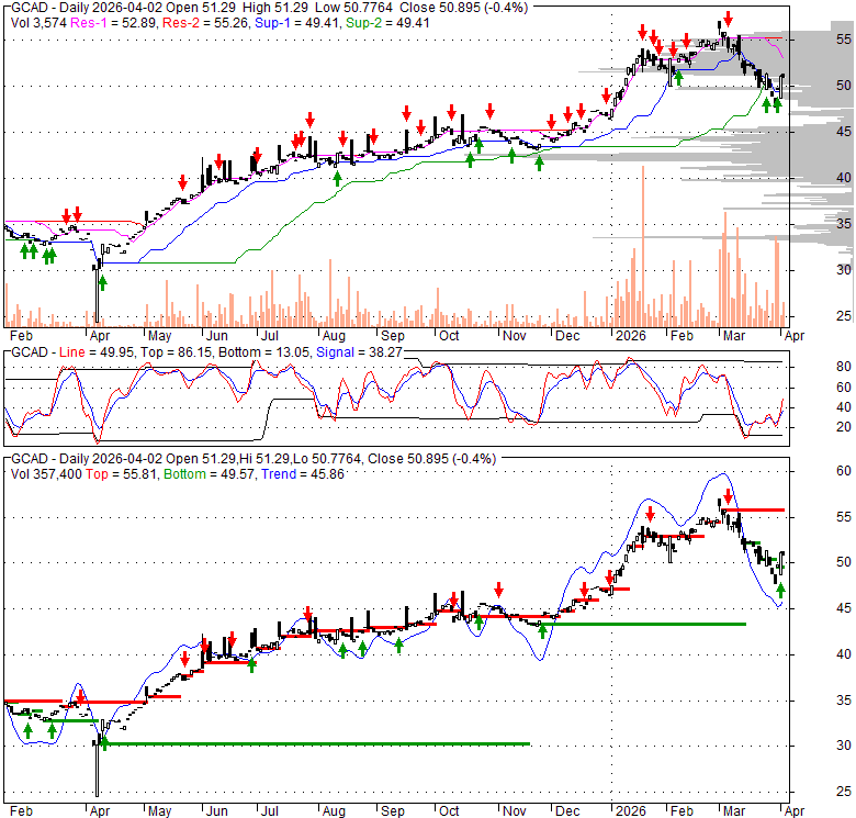 Price has closed above its short-term moving average. Short-term moving average is currently below mid-term; and above long-term moving average. From the relationship between price and moving averages: This stock is NEUTRAL in short-term; and NEUTRAL in mid-long term.[ GCAD ] has closed below upper band by 44.4%. Bollinger Bands are 24.6% wider than normal. The current width of the bands does not suggest anything about the future direction or movement of prices.