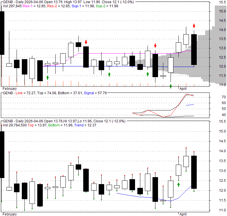 Price has closed below its short-term moving average. Short-term moving average is currently below mid-term; and below long-term moving average. From the relationship between price and moving averages: This stock is NEUTRAL in short-term; and NEUTRAL in mid-long term.[ GENB ] has closed above bottom band by 42.0%. Bollinger Bands are 0% narrower than normal.