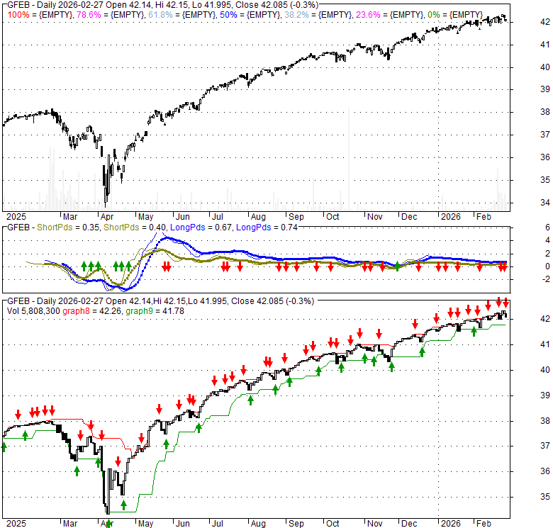Price has closed below its short-term moving average. Short-term moving average is currently above mid-term; and above long-term moving average. From the relationship between price and moving averages: This stock is NEUTRAL in short-term; and BULLISH in mid-long term.[ GFEB ] has closed above bottom band by 40.5%. Bollinger Bands are 29.9% narrower than normal. The current width of the bands does not suggest anything about the future direction or movement of prices.