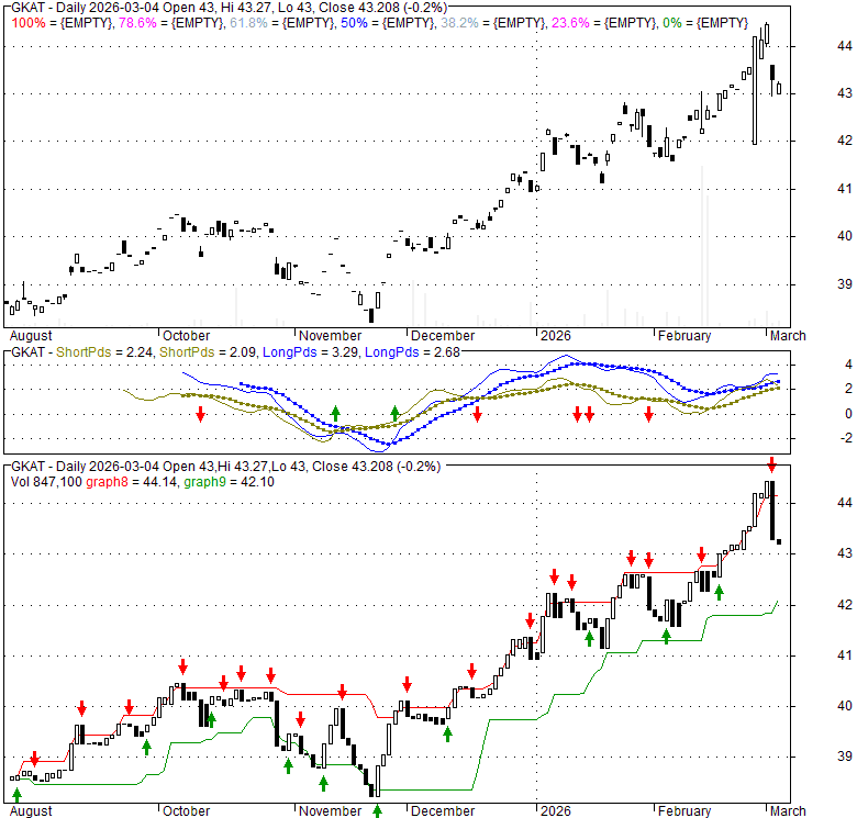 Price has closed below its short-term moving average. Short-term moving average is currently above mid-term; and above long-term moving average. From the relationship between price and moving averages: This stock is NEUTRAL in short-term; and BULLISH in mid-long term.[ GKAT ] has closed above bottom band by 48.3%. Bollinger Bands are 42.9% wider than normal. The large width of the bands suggest high volatility as compared to its normal range. The bands have been in this wide range for 4 days. This is a sign that the current trend might continue.