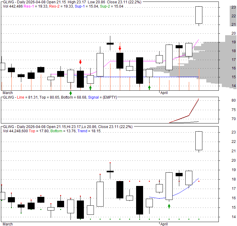 Price has closed above its short-term moving average. Short-term moving average is currently below mid-term; and below long-term moving average. From the relationship between price and moving averages: This stock is NEUTRAL in short-term; and NEUTRAL in mid-long term.[ GLWG ] has closed Bollinger Bands are 0% narrower than normal.