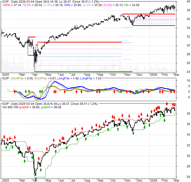 Price has closed below its short-term moving average. Short-term moving average is currently above mid-term; and above long-term moving average. From the relationship between price and moving averages: This stock is NEUTRAL in short-term; and BULLISH in mid-long term.[ GOP ] has closed above bottom band by 29.8%. Bollinger Bands are 24.1% narrower than normal. The current width of the bands does not suggest anything about the future direction or movement of prices.