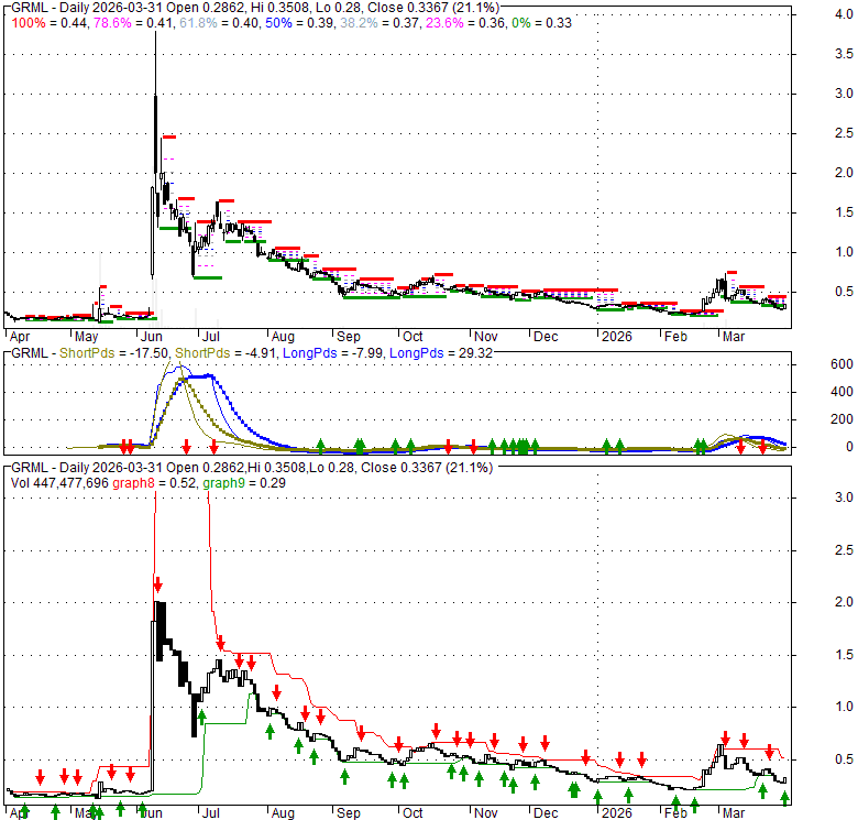 Price has closed above its short-term moving average. Short-term moving average is currently below mid-term; and below long-term moving average. From the relationship between price and moving averages: This stock is NEUTRAL in short-term; and BEARISH in mid-long term.[ GRML ] has closed above bottom band by 35.2%. Bollinger Bands are 40.6% wider than normal. The large width of the bands suggest high volatility as compared to its normal range. The bands have been in this wide range for 3 days. This is a sign that the current trend might continue.