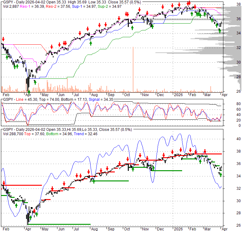 Price has closed above its short-term moving average. Short-term moving average is currently below mid-term; and below long-term moving average. From the relationship between price and moving averages: This stock is NEUTRAL in short-term; and BEARISH in mid-long term.[ GSPY ] has closed below upper band by 49.2%. Bollinger Bands are 50.1% wider than normal. The large width of the bands suggest high volatility as compared to its normal range. The bands have been in this wide range for 9 days. This is a sign that the current trend might continue.