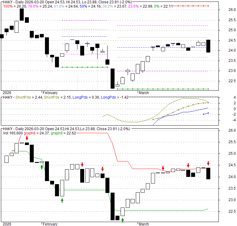 Price has closed below its short-term moving average. Short-term moving average is currently below mid-term; and below long-term moving average. From the relationship between price and moving averages: This stock is NEUTRAL in short-term; and NEUTRAL in mid-long term.[ HAKY ] has closed above bottom band by 37.3%. Bollinger Bands are 0% narrower than normal.