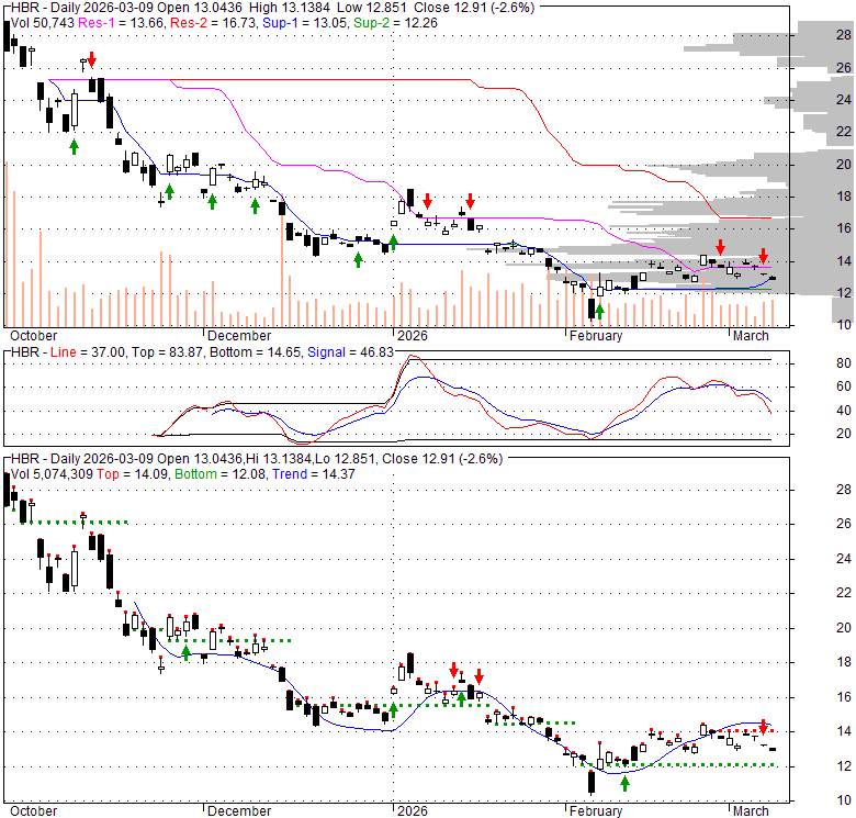 Price has closed below its short-term moving average. Short-term moving average is currently below mid-term; and below long-term moving average. From the relationship between price and moving averages: This stock is BEARISH in short-term; and NEUTRAL in mid-long term.[ HBR ] has closed above bottom band by 9.2%. Bollinger Bands are 0% narrower than normal.
