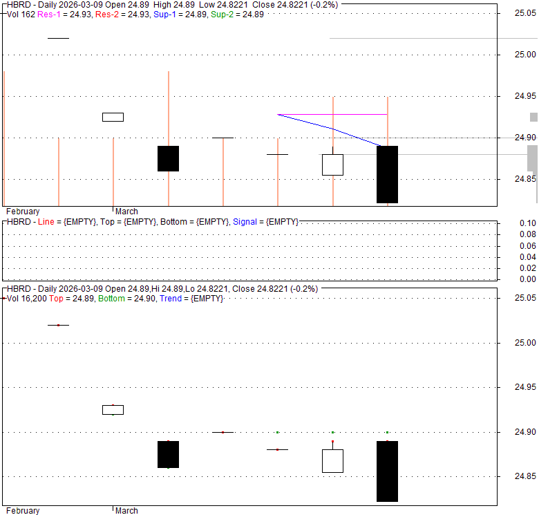 Price has closed below its short-term moving average. Short-term moving average is currently below mid-term; and below long-term moving average. From the relationship between price and moving averages: This stock is NEUTRAL in short-term; and NEUTRAL in mid-long term.[ HBRD ] has closed Bollinger Bands are 0% narrower than normal.