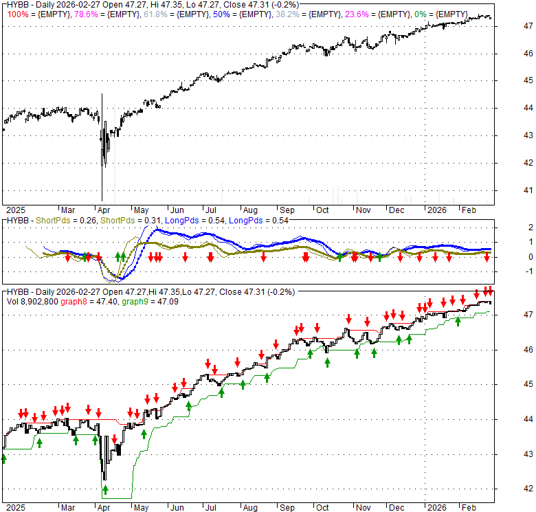 Price has closed below its short-term moving average. Short-term moving average is currently above mid-term; and above long-term moving average. From the relationship between price and moving averages: This stock is NEUTRAL in short-term; and BULLISH in mid-long term.[ HYBB ] has closed above bottom band by 44.7%. Bollinger Bands are 44.6% narrower than normal. The narrow width of the bands suggests low volatility as compared to its normal range. The bands have been in this narrow range for 0 bars. This is a sign that the market may be about to initiate a new trend.