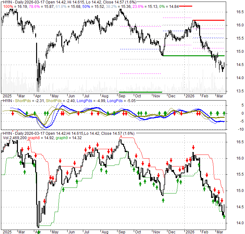 Price has closed above its short-term moving average. Short-term moving average is currently below mid-term; and below long-term moving average. From the relationship between price and moving averages: This stock is NEUTRAL in short-term; and BEARISH in mid-long term.[ HYIN ] has closed above bottom band by 41.4%. Bollinger Bands are 13.3% wider than normal. The current width of the bands does not suggest anything about the future direction or movement of prices.