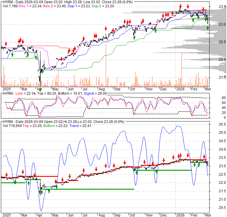 Price has closed below its short-term moving average. Short-term moving average is currently below mid-term; and above long-term moving average. From the relationship between price and moving averages: This stock is BEARISH in short-term; and NEUTRAL in mid-long term.[ HYRM ] has closed above bottom band by 24.0%. Bollinger Bands are 1.4% wider than normal. The current width of the bands does not suggest anything about the future direction or movement of prices.