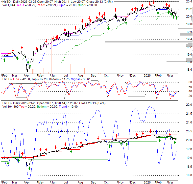 Price has closed above its short-term moving average. Short-term moving average is currently below mid-term; and below long-term moving average. From the relationship between price and moving averages: This stock is NEUTRAL in short-term; and NEUTRAL in mid-long term.[ HYSD ] has closed below upper band by 47.6%. Bollinger Bands are 43.3% wider than normal. The large width of the bands suggest high volatility as compared to its normal range. The bands have been in this wide range for 7 days. This is a sign that the current trend might continue.