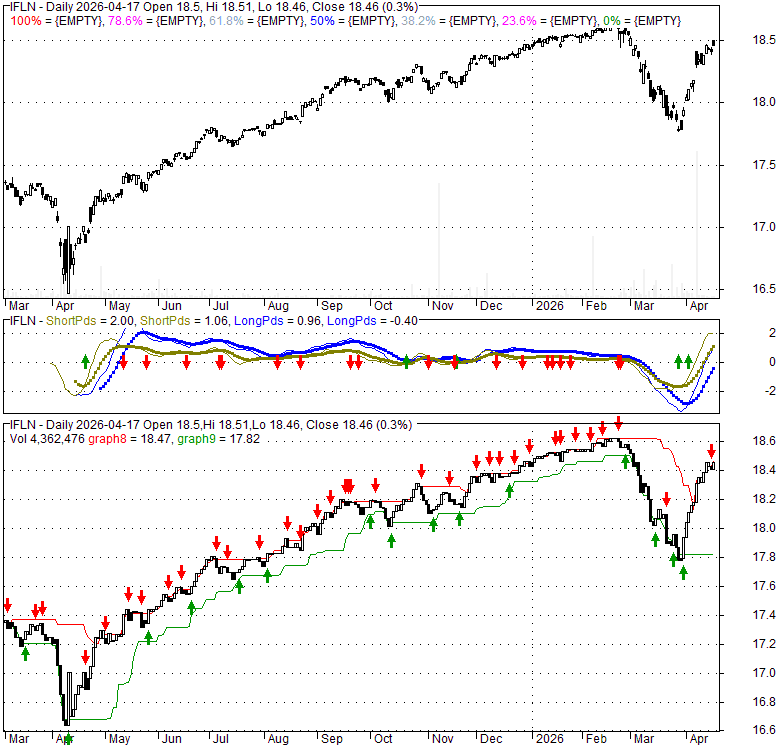 Price has closed below its short-term moving average. Short-term moving average is currently above mid-term; and above long-term moving average. From the relationship between price and moving averages: This stock is NEUTRAL in short-term; and NEUTRAL in mid-long term.[ IFLN ] has closed below upper band by 36.3%. Bollinger Bands are 161.9% wider than normal. The large width of the bands suggest high volatility as compared to its normal range. The bands have been in this wide range for 11 days. This is a sign that the current trend might continue.
