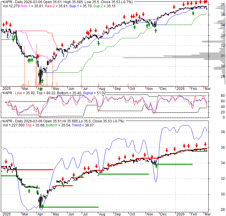 Price has closed below its short-term moving average. Short-term moving average is currently above mid-term; and above long-term moving average. From the relationship between price and moving averages: This stock is NEUTRAL in short-term; and BULLISH in mid-long term.[ KAPR ] has closed below the lower bollinger band by 22.7%. Although price has broken the lower band and a downside breakout is possible; the most likely direction for [ KAPR ] is to continue within current trading range. It is unclear right now based on current values. 44.3% narrower than normal. The narrow width of the bands suggests low volatility as compared to its normal range. The bands have been in this narrow range for 28 bars. This is a sign that the market may be about to initiate a new trend.