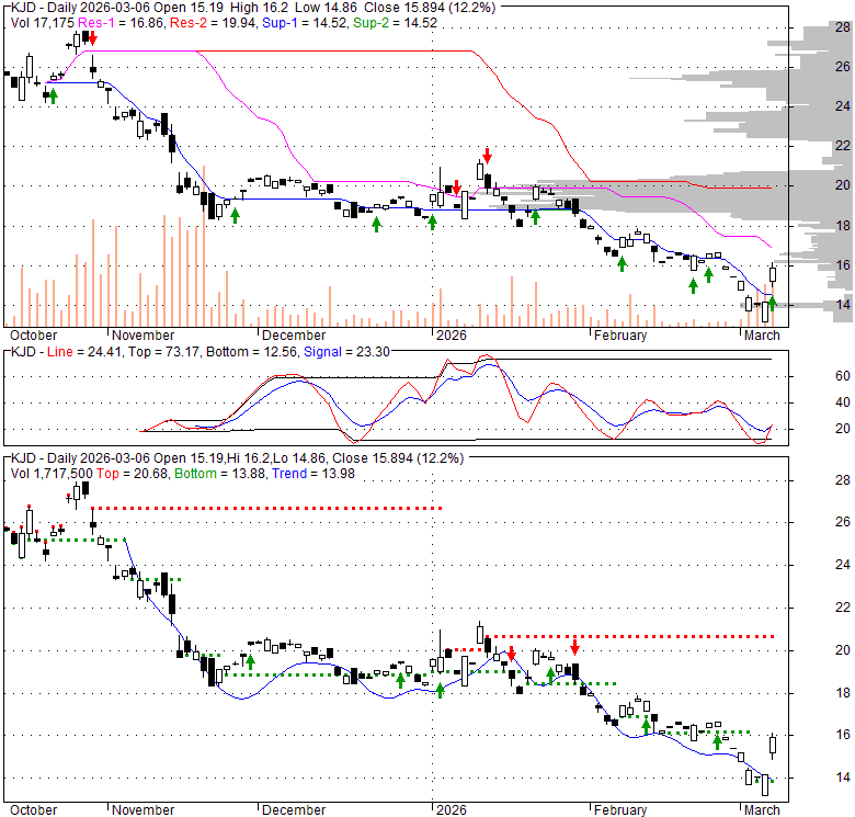 Price has closed above its short-term moving average. Short-term moving average is currently below mid-term; and below long-term moving average. From the relationship between price and moving averages: This stock is NEUTRAL in short-term; and NEUTRAL in mid-long term.[ KJD ] has closed below upper band by 46.3%. Bollinger Bands are 0% narrower than normal.