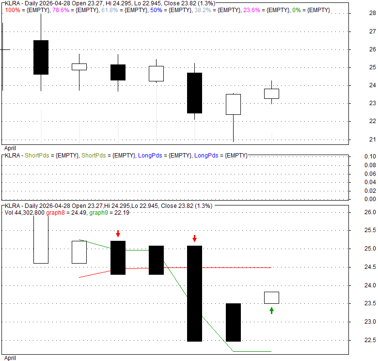 Price has closed below its short-term moving average. Short-term moving average is currently below mid-term; and below long-term moving average. From the relationship between price and moving averages: This stock is NEUTRAL in short-term; and NEUTRAL in mid-long term.[ KLRA ] has closed Bollinger Bands are 0% narrower than normal.