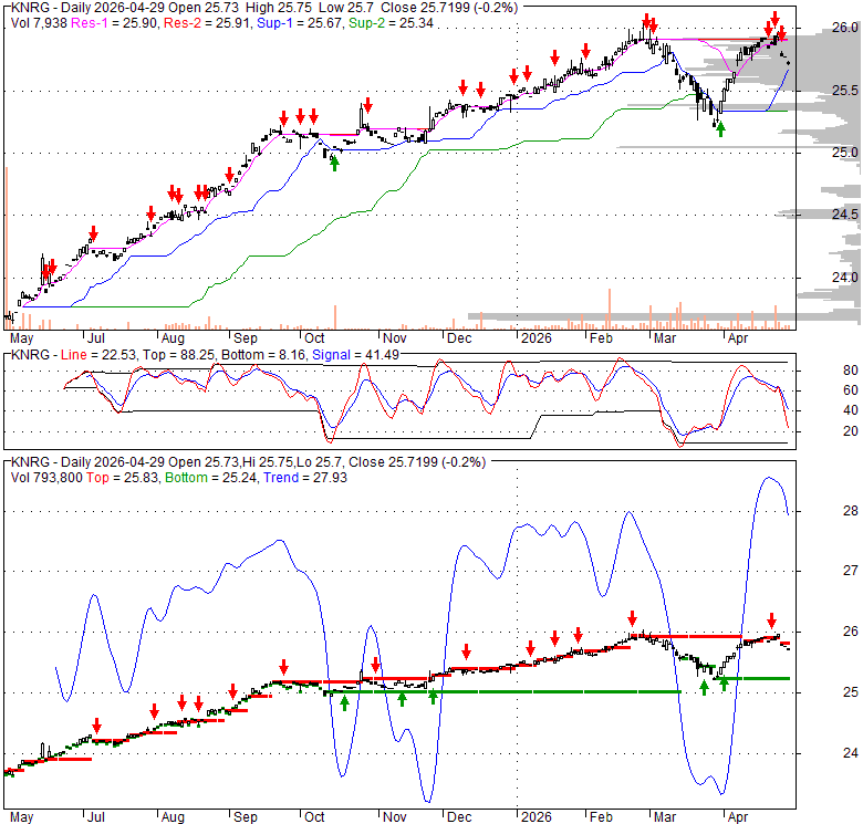 Price has closed below its short-term moving average. Short-term moving average is currently above mid-term; and above long-term moving average. From the relationship between price and moving averages: This stock is NEUTRAL in short-term; and BULLISH in mid-long term.[ KNRG ] has closed above bottom band by 21.4%. Bollinger Bands are 34.2% narrower than normal. The current width of the bands does not suggest anything about the future direction or movement of prices.