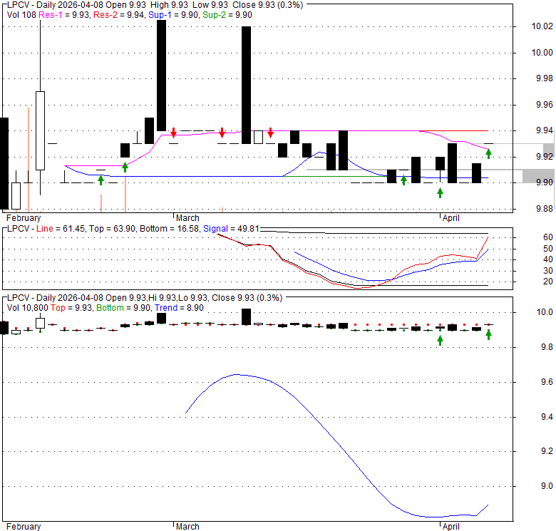 Price has closed above its short-term moving average. Short-term moving average is currently below mid-term; and below long-term moving average. From the relationship between price and moving averages: This stock is NEUTRAL in short-term; and NEUTRAL in mid-long term.[ LPCV ] has closed Bollinger Bands are 0% narrower than normal.