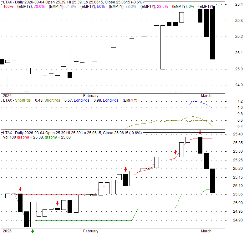 Price has closed below its short-term moving average. Short-term moving average is currently below mid-term; and below long-term moving average. From the relationship between price and moving averages: This stock is NEUTRAL in short-term; and NEUTRAL in mid-long term.[ LTAX ] has closed below the lower bollinger band by 0.8%. If price is in a downtrend band; this downward trend might continue. However a short term pullback inside the band is likely. Bollinger Bands are 0% narrower than normal.
