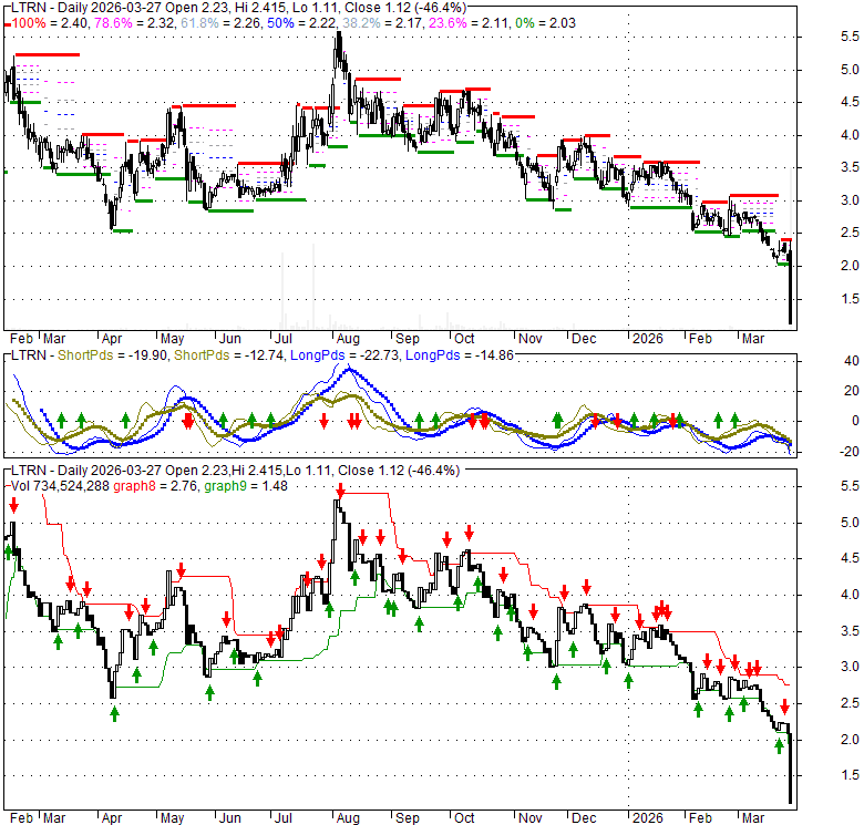 Price has closed below its short-term moving average. Short-term moving average is currently below mid-term; and below long-term moving average. From the relationship between price and moving averages: This stock is BEARISH in short-term; and BEARISH in mid-long term.[ LTRN ] has closed below the lower bollinger band by 27.3%. If price is in a downtrend band; this downward trend might continue. However a short term pullback inside the band is likely. Bollinger Bands are 94% wider than normal. The large width of the bands suggest high volatility as compared to its normal range. The bands have been in this wide range for 0 days. This is a sign that the current trend might continue.