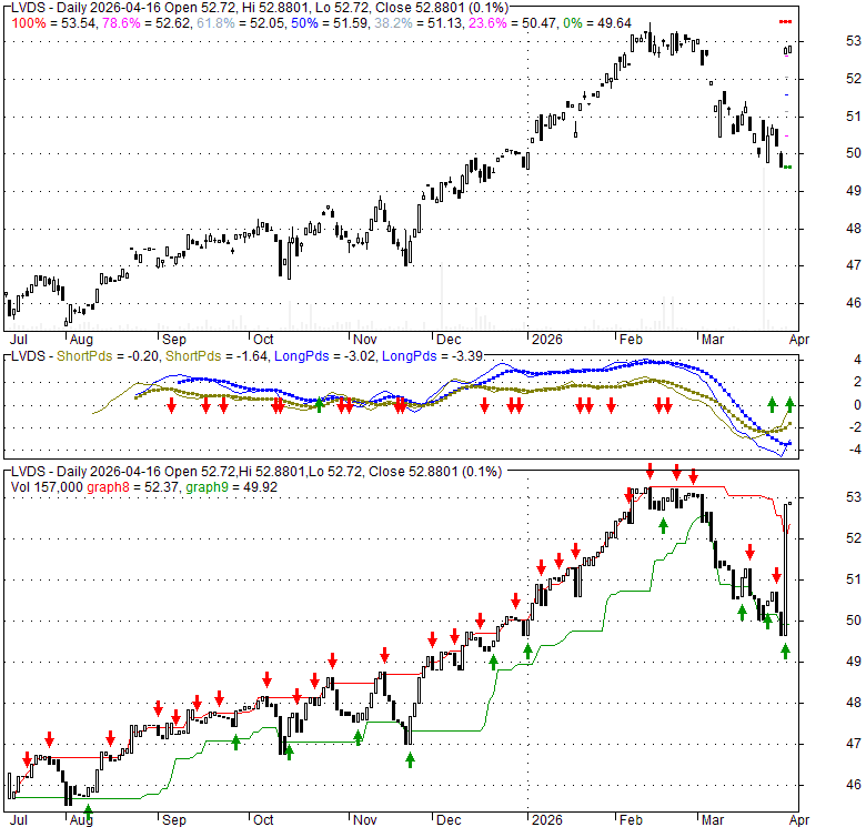 Price has closed above its short-term moving average. Short-term moving average is currently below mid-term; and above long-term moving average. From the relationship between price and moving averages: This stock is NEUTRAL in short-term; and NEUTRAL in mid-long term.[ LVDS ] has closed Bollinger Bands are 80.8% wider than normal. The large width of the bands suggest high volatility as compared to its normal range. The bands have been in this wide range for 1 days. This is a sign that the current trend might continue.