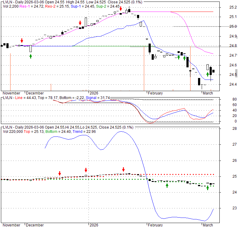 Price has closed above its short-term moving average. Short-term moving average is currently below mid-term; and below long-term moving average. From the relationship between price and moving averages: This stock is NEUTRAL in short-term; and NEUTRAL in mid-long term.[ LVLN ] has closed above bottom band by 40.1%. Bollinger Bands are 0% narrower than normal.